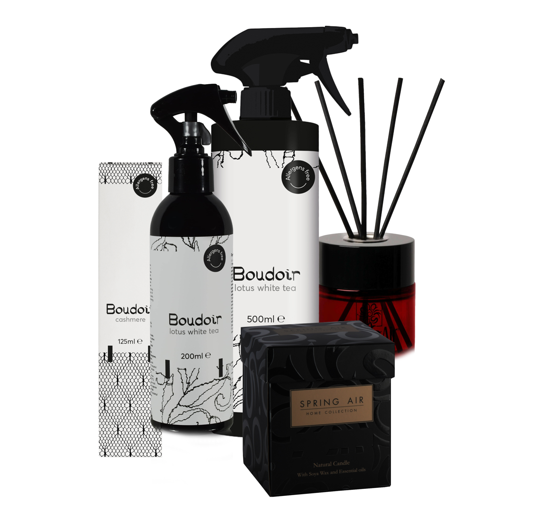 تتوفر هذه الروائح بأشكال مختلفة تناسب جميع الاستخدامات. هناك عبوات بخاخ 500 مل للاستعمال المنزلي تمنح انتعاشاً طويل الأمد للغرف، ونفس الروائح تأتي أيضاً في بخاخات 200 مل للاستعمال الشخصي اليومي. كما تقدم SpringAir هذه الروائح في شكل شمع وعيدان لنشر العطر بشكل مستمر وأنيق داخل المساحات. ومن بين هذه المجموعة، هناك صنف خاص باسم Cashmere مخصص للأشخاص الذين يعانون من الحساسية تجاه الروائح، حيث إنه خالٍ من مسببات التحسس والمهيجات.